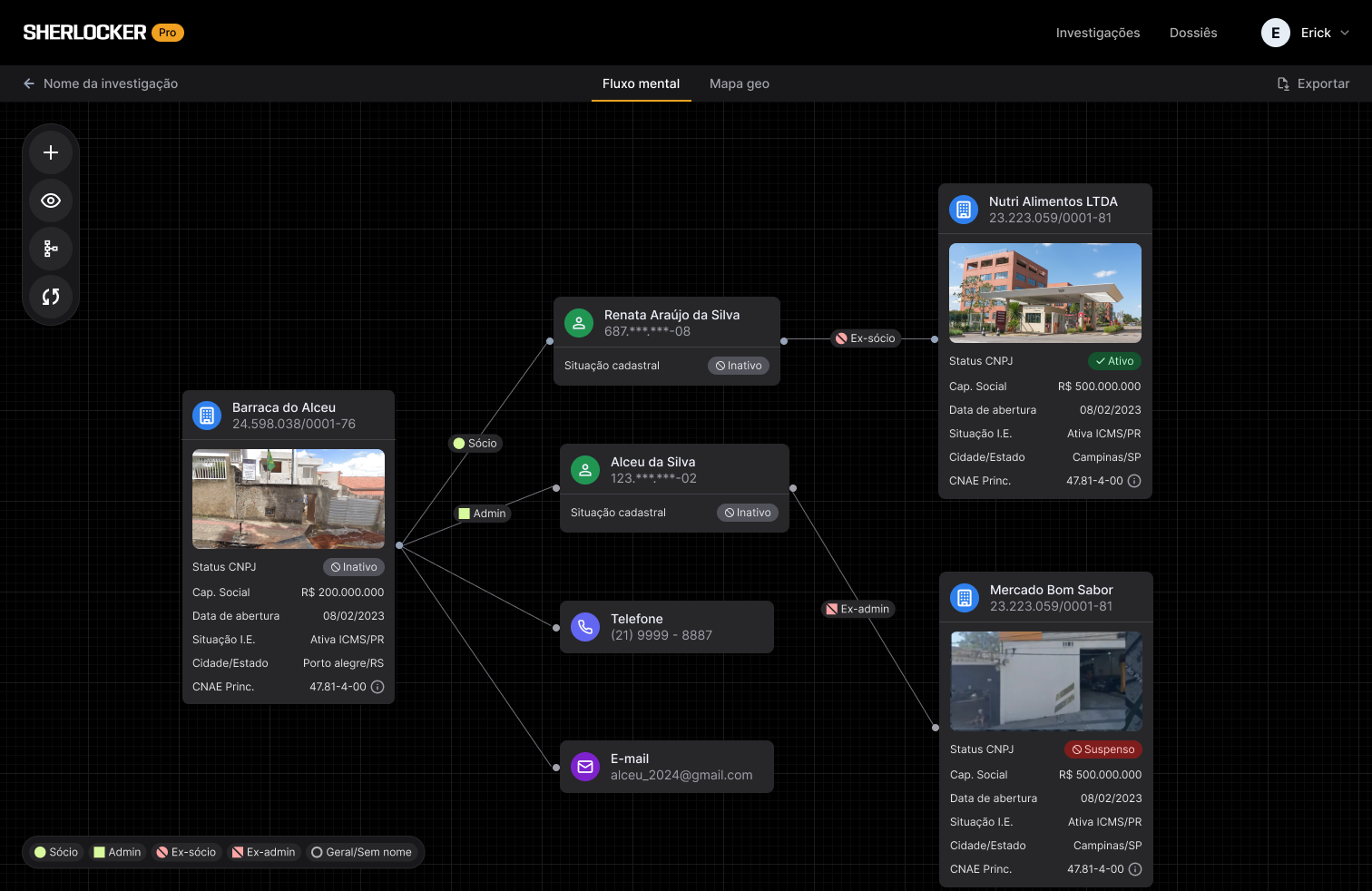 Diferente de ferramentas tradicionais que entregam telas estaticas e dados rasos, o Sherlocker conecta o que ninguem conecta: OSINT, dados empresariais, vinculos ocultos e patrimonio dissimulado em um grafo visual interativo — te entregando o suficiente para ser perigoso.