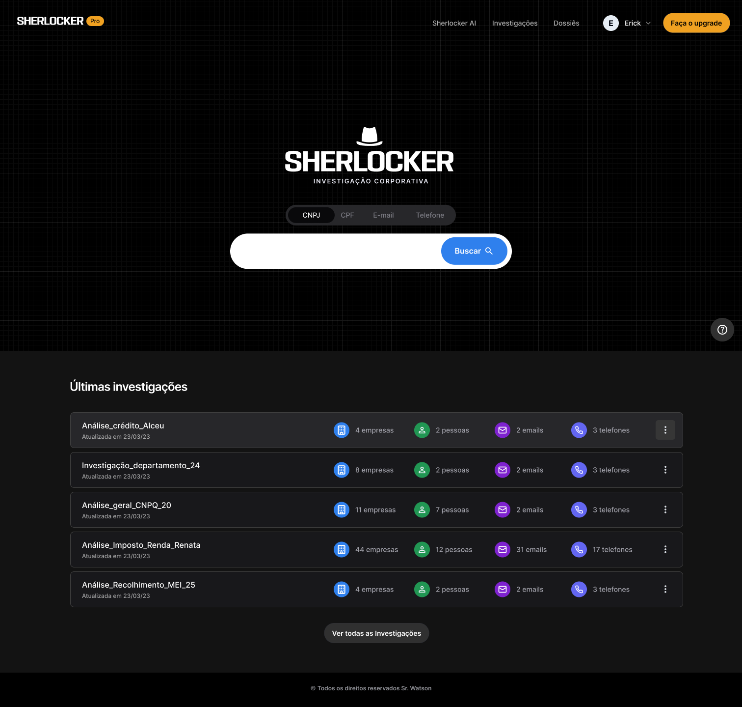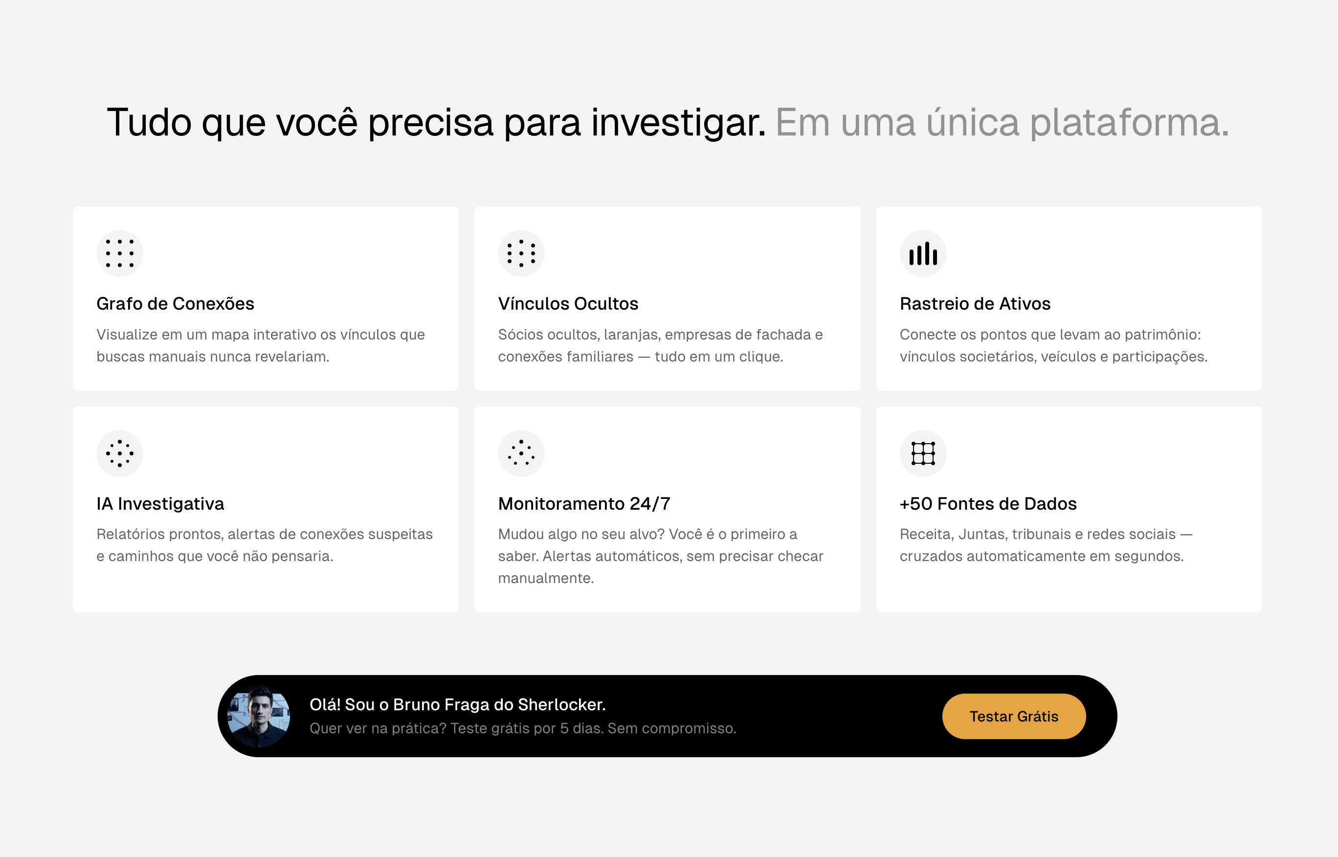 o Sherlocker e a plataforma de investigacao empresarial com IA que entrega inteligencia de nivel agencia — cruzando dados de internet, redes sociais, fontes oficiais e comportamento digital — em segundos, nao semanas.