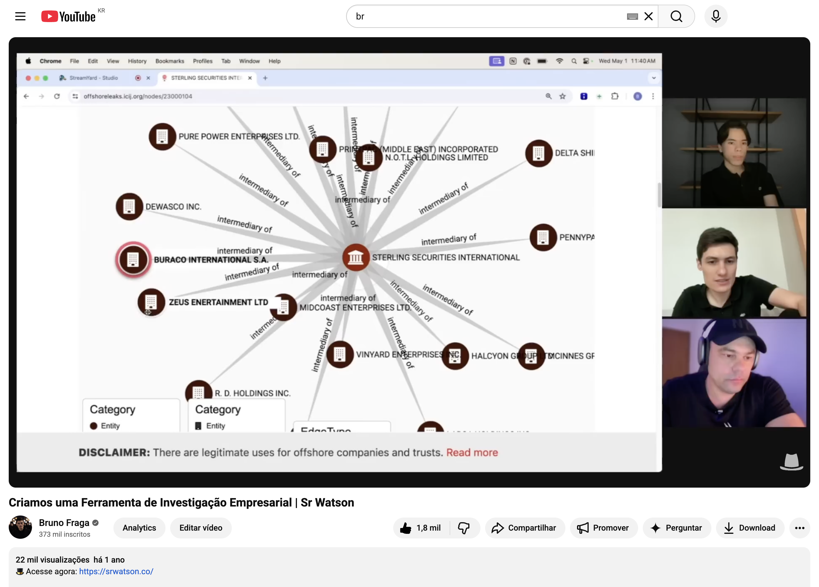 Foi quando, num intensivao de 24 horas documentado no YouTube, eu, o Diego e o Alonso criamos o Sr. Watson — uma ferramenta gratuita para investigar conexoes entre empresas e socios no Brasil. Em 3 meses, alcancamos uma marca expressiva: 125 mil visitas.