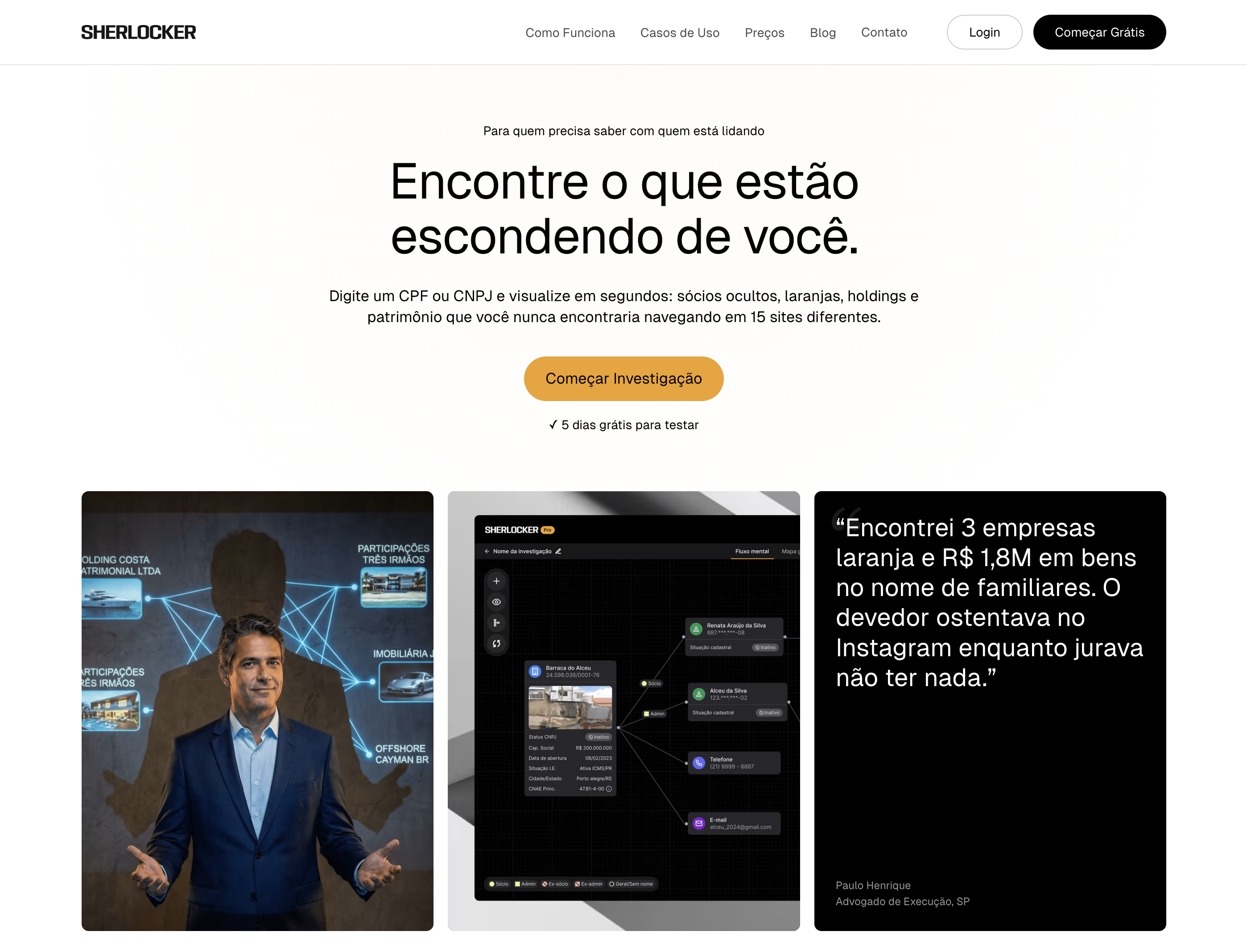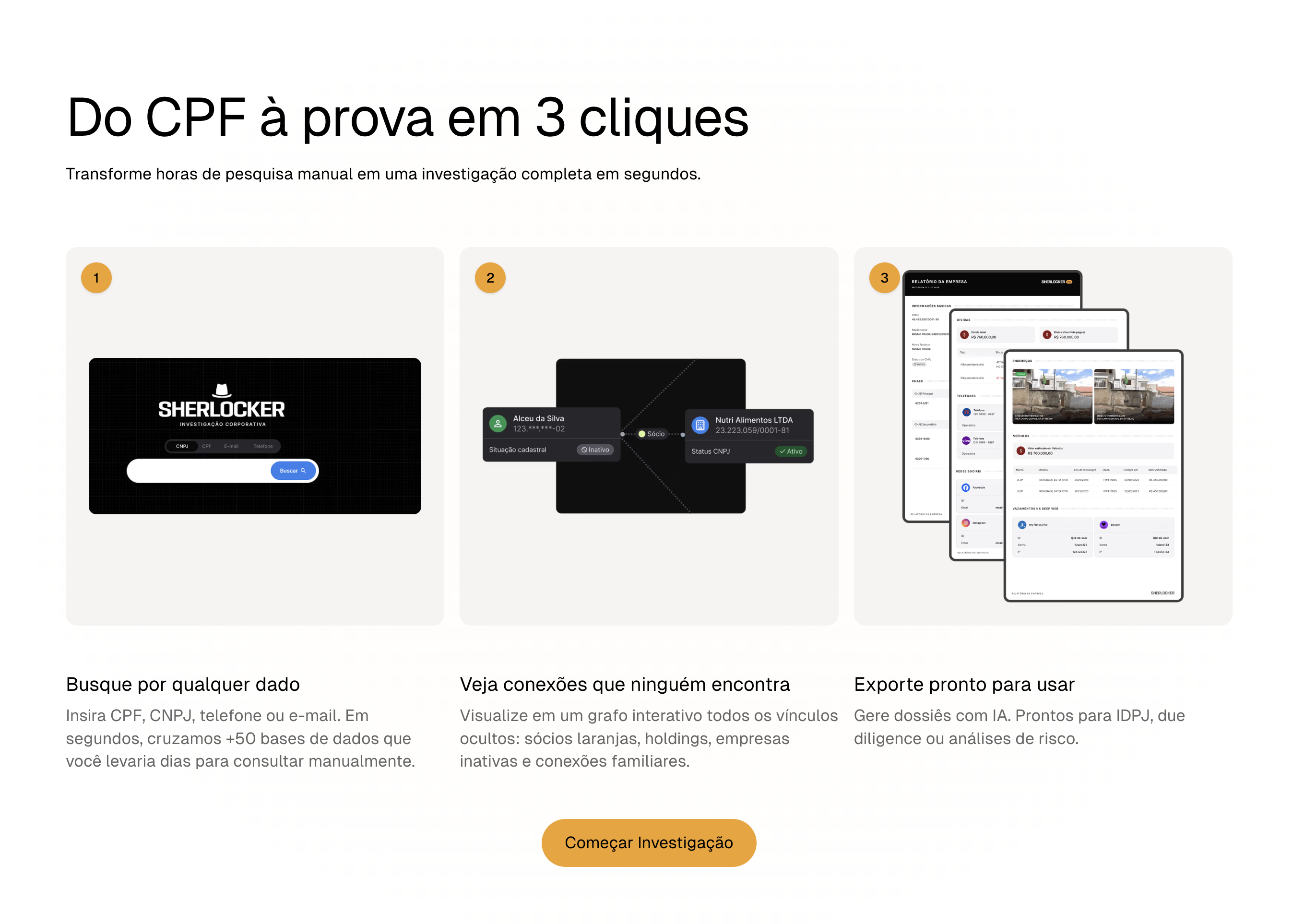 Foi ai que comprei a missao: tornar a investigacao empresarial mais simples e eficaz no Brasil. Dois meses de desenvolvimento intenso depois, nasceu o Sherlocker.