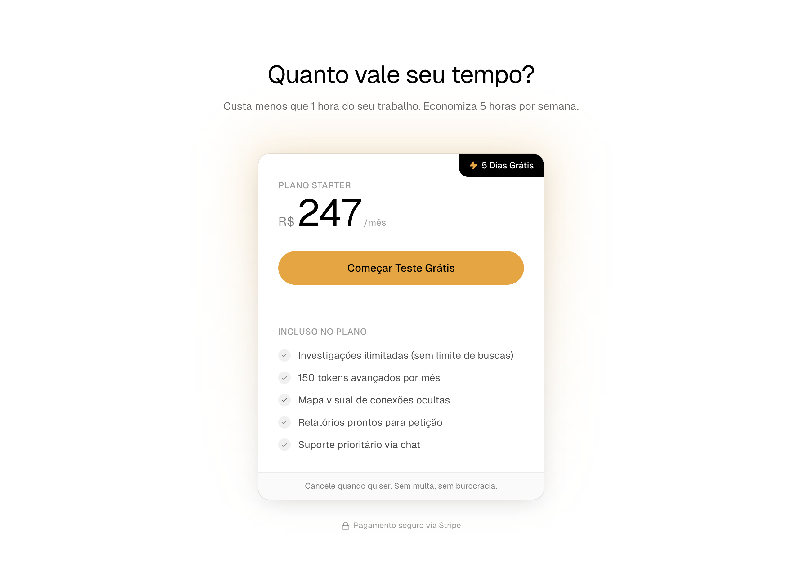 “Tornar a investigacao empresarial no Brasil simples e acessivel — com a ousadia e a inovacao que o mercado precisa.”